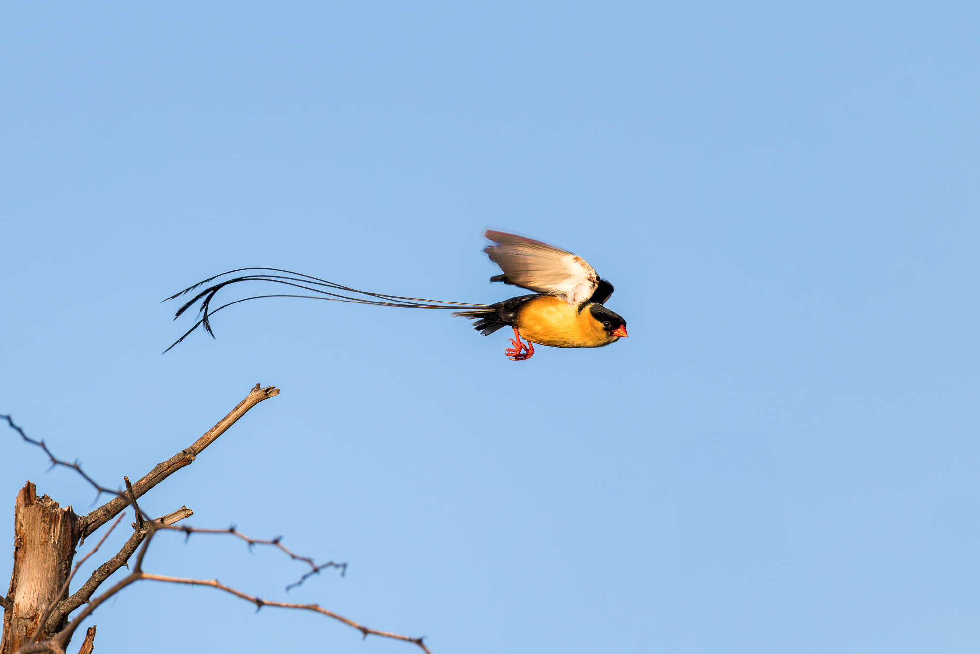 To make a lasting impression on potential partners, many males change into striking breeding plumage with bold colours, longer tails and, in some cases, behaviour that seems a bit enthusiastic. The African paradise flycatcher and the different paradise whydah are good examples, suddenly looking as if they have stepped out in their finest. Other southern African show-offs include the pin-tailed whydah, various widowbirds with their sweeping tails and the bright southern red bishop.